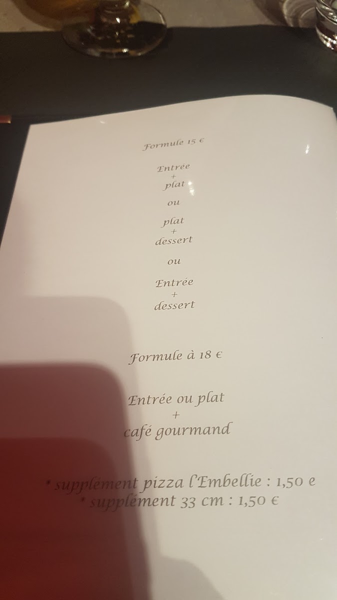 The restaurant also offers a variety of pizzas. Pizza Chèvre Miel is a standout, with the perfect balance of sweet honey and creamy goat cheese. For something heartier, you can go for Supplement Pizza L'embellie, a more indulgent option with extra toppings. The menu also includes traditional Italian options such as Spaghetti À la Bolognaise, a flavorful dish that perfectly captures the essence of Italy with its rich meat sauce.